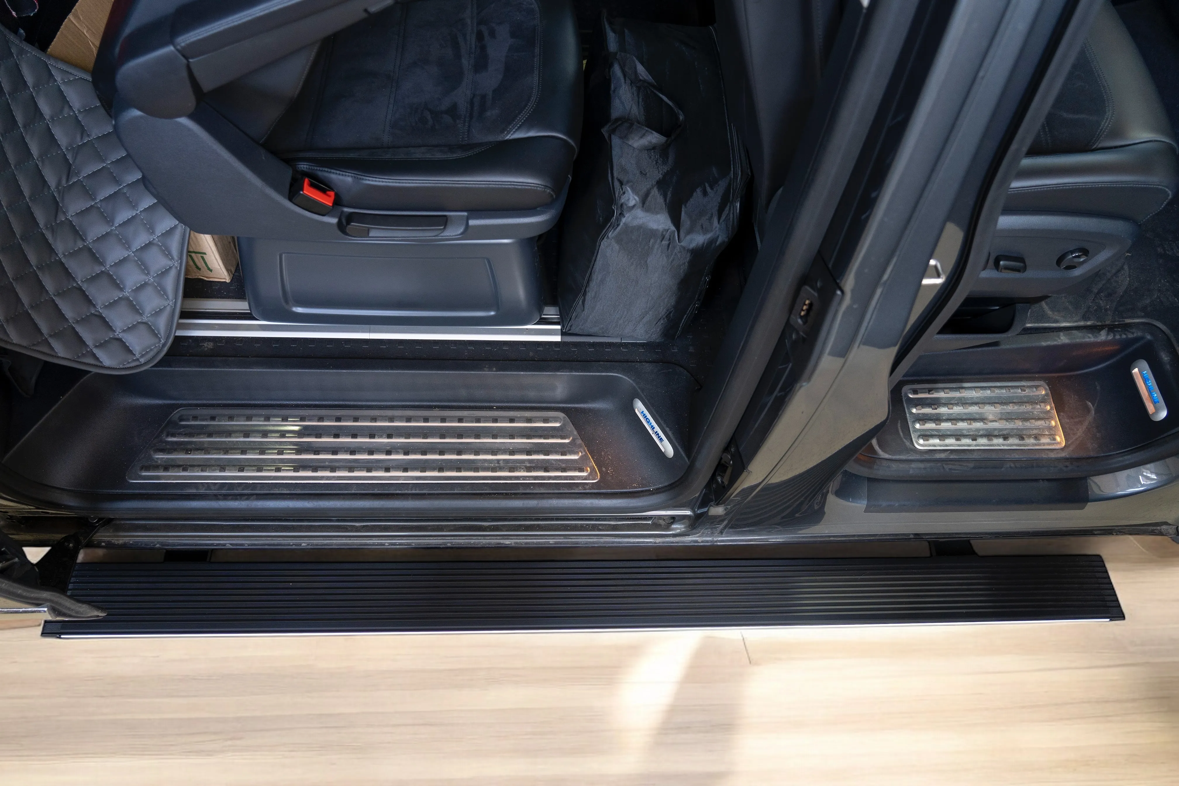 Premium Electric Side Steps // For this luxury SUV build, the Gangsta Paradise automatic running boards serve as the ultimate accessibility upgrade, proving that style and function can coexist seamlessly. Outfitted with integrated LED lighting, these steps were custom-configured at the client's request, who approached us after market options failed to meet both durability and design standards. The goal was to create steps that looked OEM+ while providing superior weather resistance. To complete the transformation, custom rubber tread inserts were added, allowing surefooted entry in all conditions—yes, even mountain terrain. The result is a perfect fusion of utility and urban sophistication.