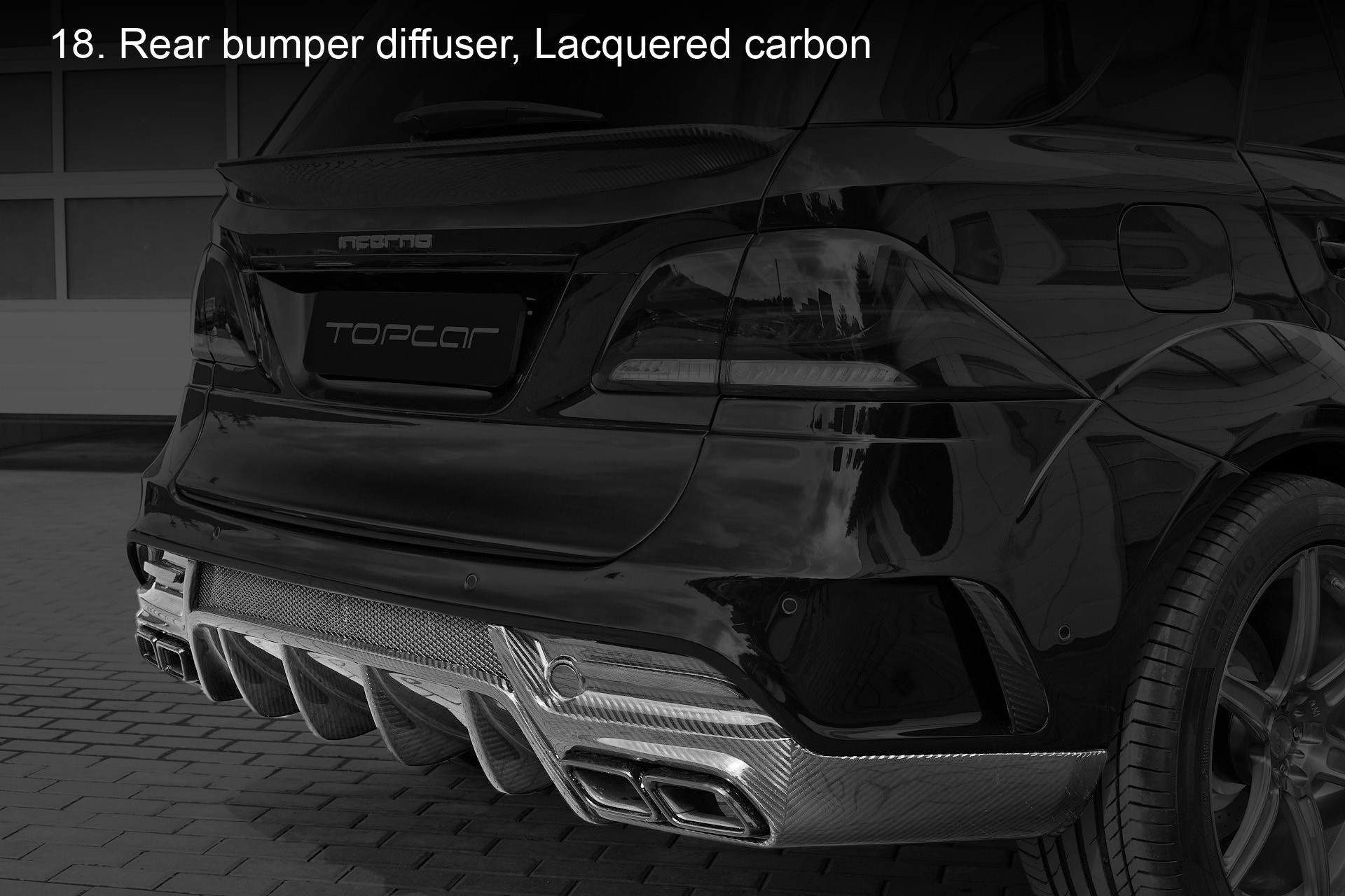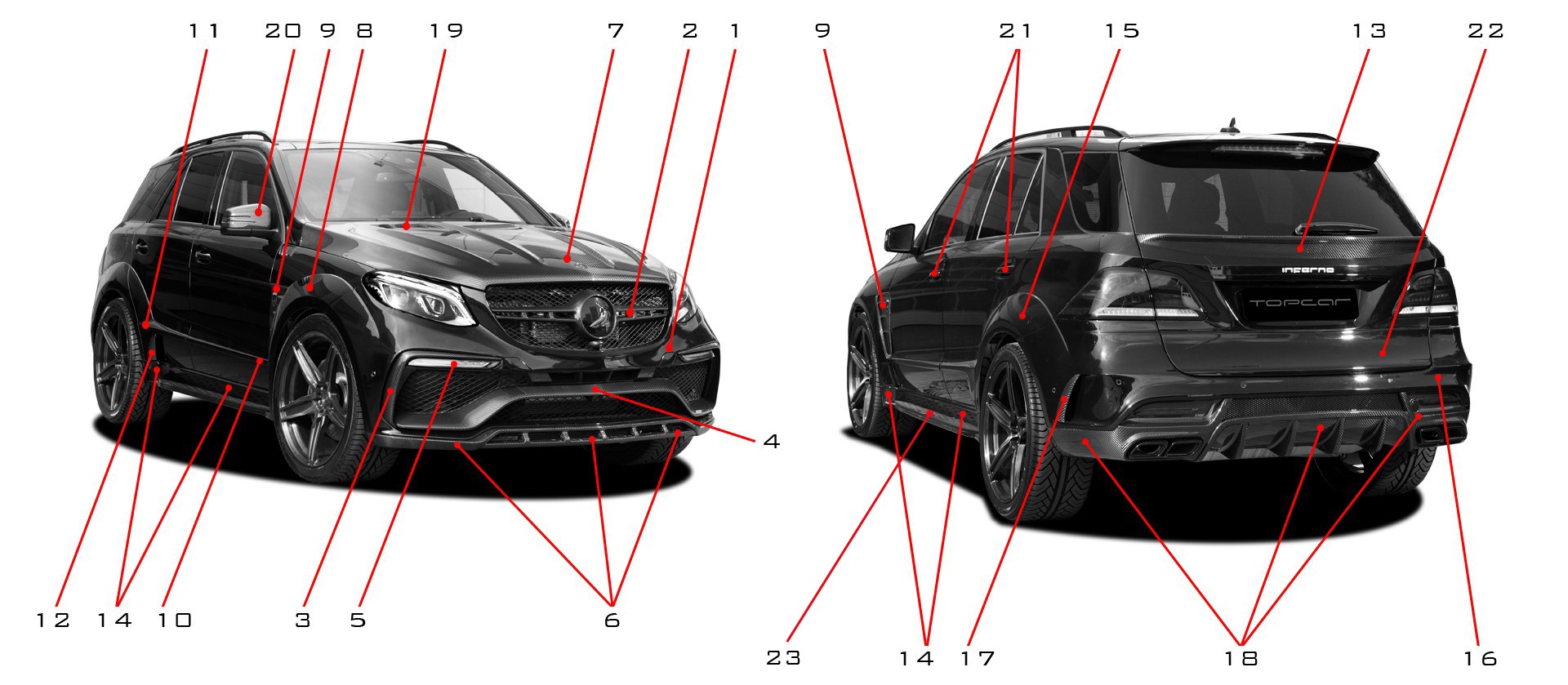 TOPCAR Company is pleased to introduce its new hit — GLE Wagon INFERNO. Traditionally, design of the aerodynamic body kit created in common with the factory key style. But INFERNO created more bold and aggressive, where the factory designers have been constrained by corporate constraints, TOPCAR’s designers showed greater scope and boldness. The aggressive design of the front bumper, carbon fiber muscular hood, extended fenders, side air intakes, a rear bumper with a large diffuser — all this creates a rapid and energetic way of the SUV.