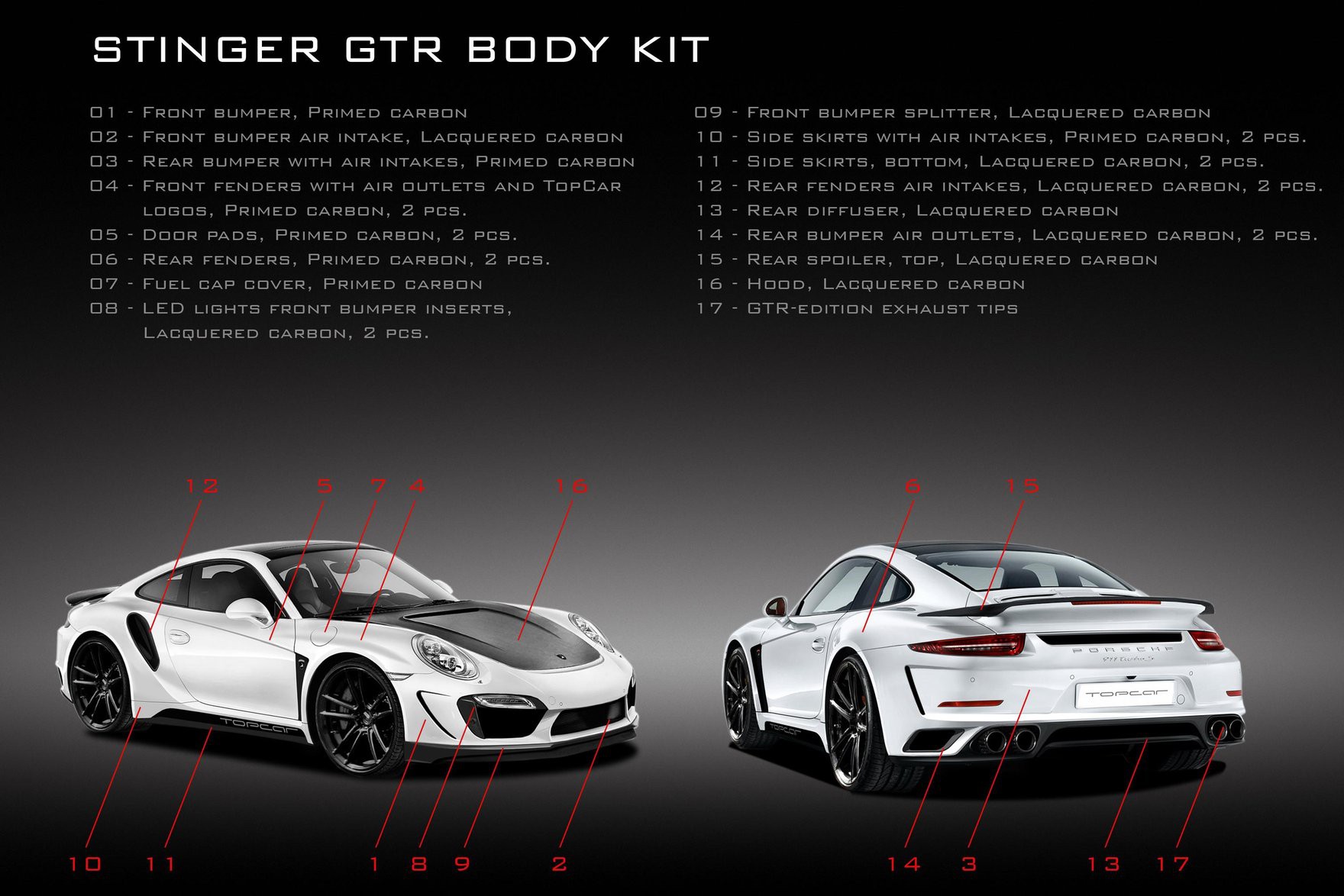 TOPCAR is happy to present the very new and the most exclusive work (tuning Porsche) of its professional life the aerodynamic kit Stinger GTR for Porsche 991 Turbo and Turbo S. This is indeed the most sophisticated project TOPCAR has ever done, it took 9 months to finish and concidered as bringing a new child to life. The kit consists of 24 class-A carbon fiber composite body panels which can be fitted professionally only at TOPCAR specialized center due to high standard precision job where 90% of exterior is to be changed completely, several carbon panels are to be bonded with the steel body using hi-tech materials and know how skills. Some parts of the kit could be lacquered to highlight the beauty of carbon fibers. Due to high complexity of the project TOPCAR specialists are only able to assemble two cars a month at their premises. By special request the kit could be assembled at clients site with TOPCAR specialists travel and accommodation costs covered. On top of that: - the car performance could be increased by 60 hp and 130 Nm. using special HP kit. - the look of your car could be personalized even further by selection of topnotch wheels from our partner ADV.1 Wheels.